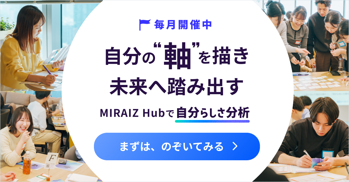 「毎日同じルーティンで、成長や貢献している実感がなくモヤモヤしている方」には、PERSOL MIRAIZ(パーソルミライズ)のMIRAIZ Hubがおすすめです。MIRAIZ Hubは、仲間と一緒にワークショップ・対話を行い、「はたらく軸」「大事にしたい価値観」などを見つけられる無料イベントです。
